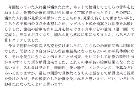 今まで何軒かのEII院で治療を受けましたが、こちらの治療前問診は印象的でした、間診により自分がどんな治療結果になったらよいのかが具体的になり、それを先生にきちんと伝えることが出来、それに対して治療の説明も分かりやすくして頂き納得出来ました、これらの事が良い治療結果になったと思います、入れ歯は見た日、機能性、使い勝手、メンテナンス、予算などいろいろありますが、最初の問診で具体的にきちんと話をして納得出来る説明を受けた方が、その後安心した治療を受けれると思います、ぜひ、いろいろお尋ねになったらよいと思います。