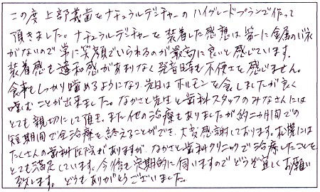 この度、上部義歯をナチュラルデンチャーのハイグレードプランで作って頂きした。ナチュラルデンチャーを装着した感想は第一に金属のバネがないので常に笑顔でいられるのが最高に良いと感じています。装着感も違和感があまりなく発音時も不便さを感じません。食事もしっかり噛めるようになり、先日はホルモンを食しましたが良く噛むことが出来ました。