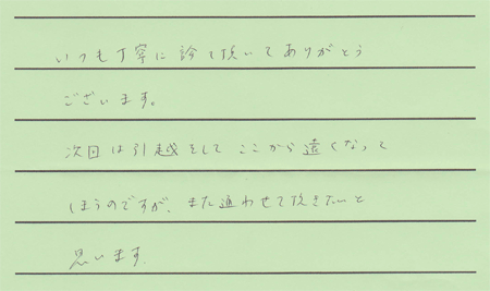 いつも丁寧に診て頂いてありがとうございます。次回は引越をしてここから遠くなってしまうのですが、また通わせて頂きたいと思います。